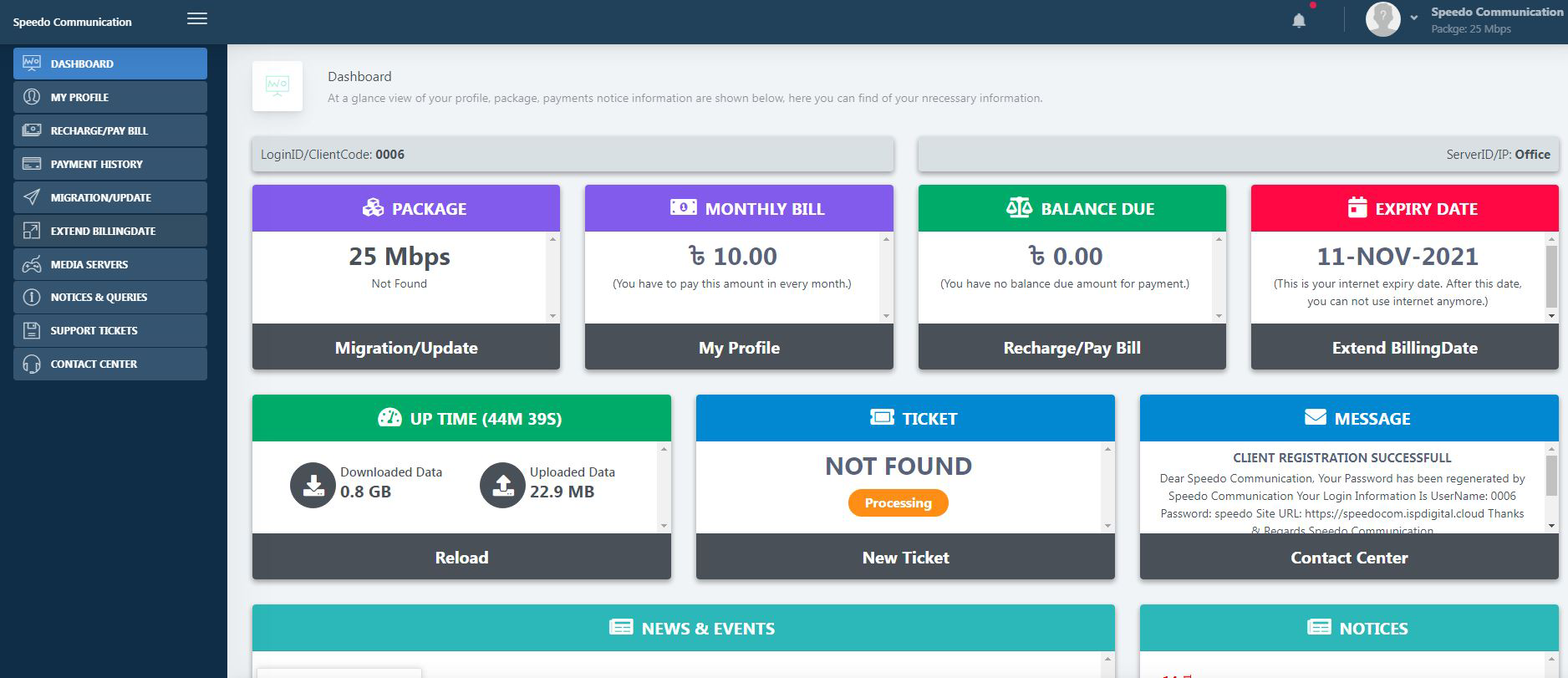 After Login you'll see an user friendly and well designed dashboard. You can easily pay bill from Recharge/Pay Bill Option. When you click on Recharge/Pay Bill option from dashboard, Bkash payment getway screen will be open. You can also get support easily by opening a Support Ticket. You can get Your package details, Our Movie,FTP,TV Server & Package Migration support.